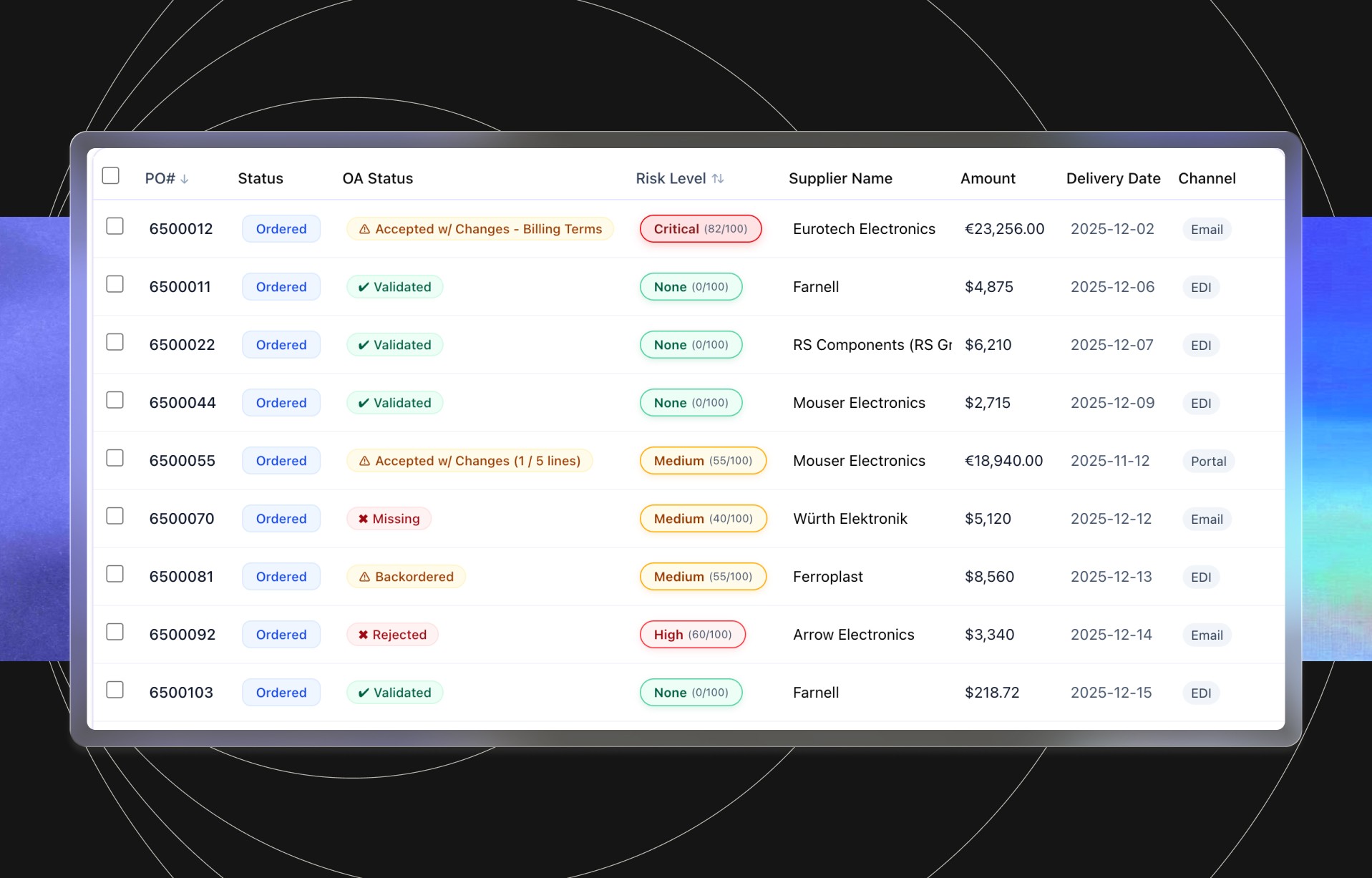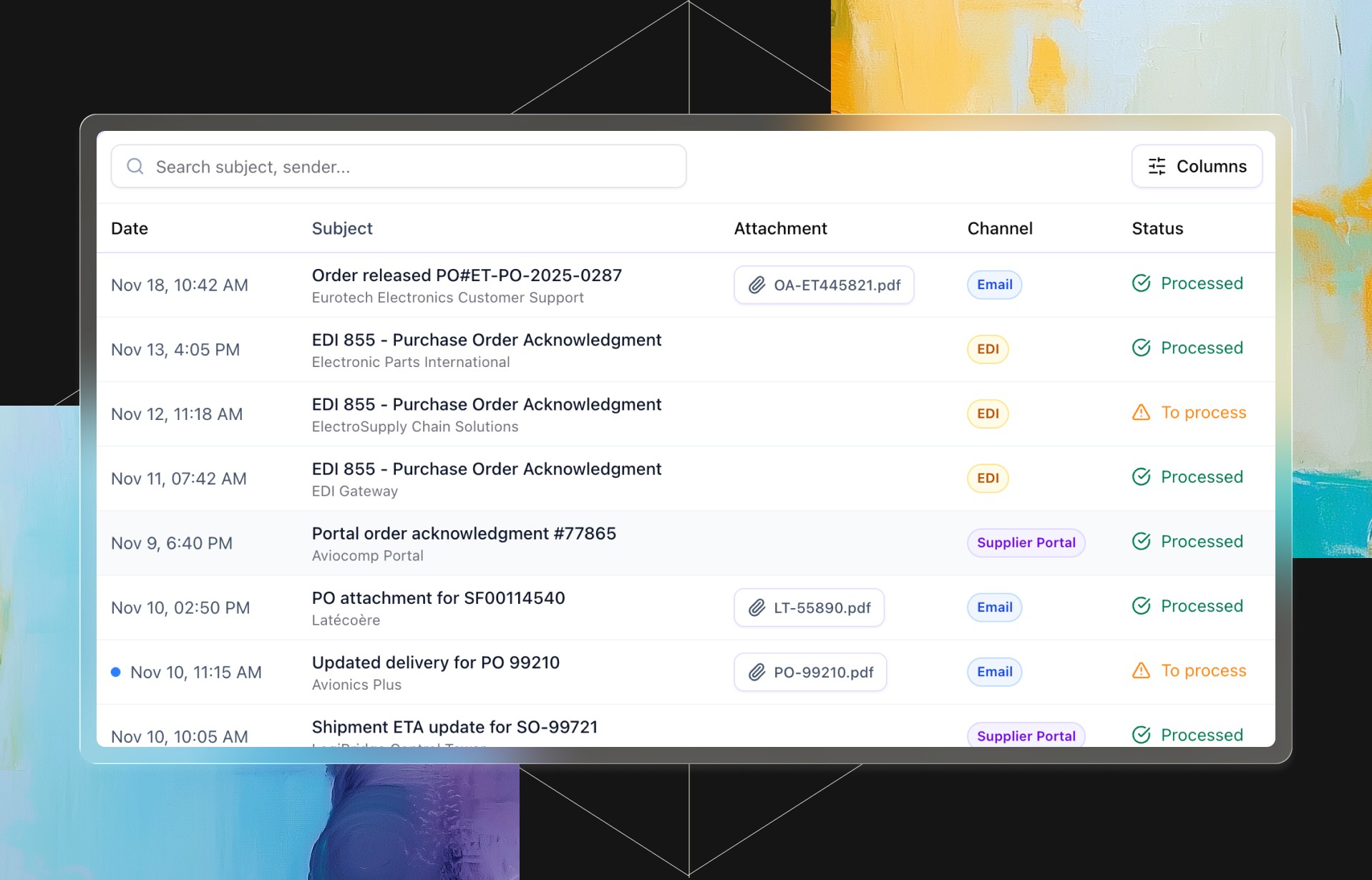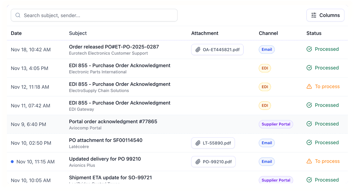 AI agents that execute supply and sales transactions — from orders to confirmations and delivery updates — with full control and traceability.